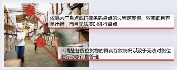依靠人工盘点或扫描条码盘点的过程速度慢、效率低且容易出错,而且无法实时进行盘点;