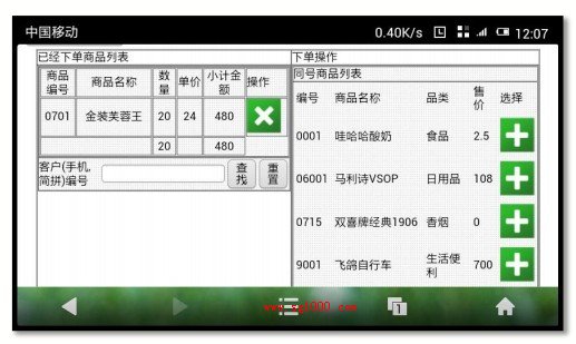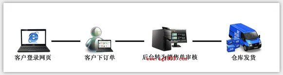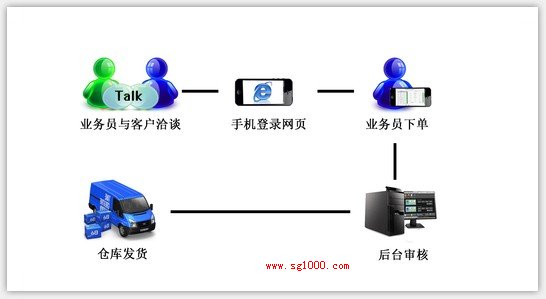 业务员外出洽谈业务,手机可以上网,业务员跟客户洽谈好交易事项后,业务员用手机登陆盛高官网使用员工编号跟密码登录网页远程开单系统,输入货品编号或者简拼查找选择货品,输入价格与数量,立即向总部提交了销售单,总部查到销售单进行审核,由仓库备货,总部进行收款发货。